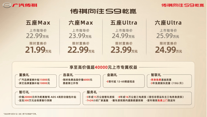 • 价格福利:上市指导价22.99万起(Max版)-25.99万起(Ultra版),提供5座/ 6座两种布局;10月31日前置换购车,享限时置换价21.99万起,更有至高价值40000元上市专属权益。