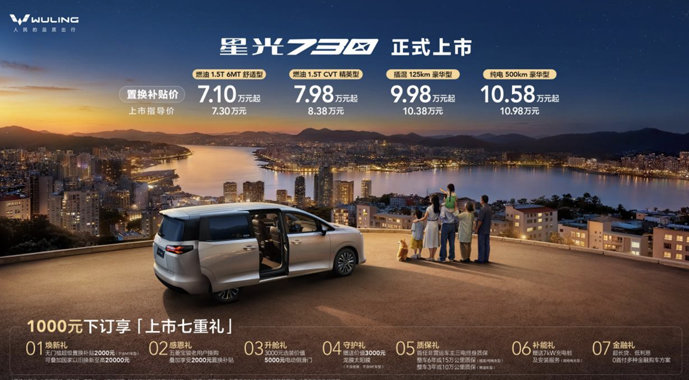 【2025年11月12日】今日,「全能舒享大7座」星光730正式上市,一门开万家,为千万中国家庭开启万种幸福可能。新车共推出四款车型配置:燃油1.5T 6MT舒适型、燃油1.5T CVT精英型、插混125km豪华型、纯电500km豪华型,上市指导价分别为7.30万元、8.38万元、10.38万元、10.98万元,更有置换补贴价7.10万元-10.58万元起。
