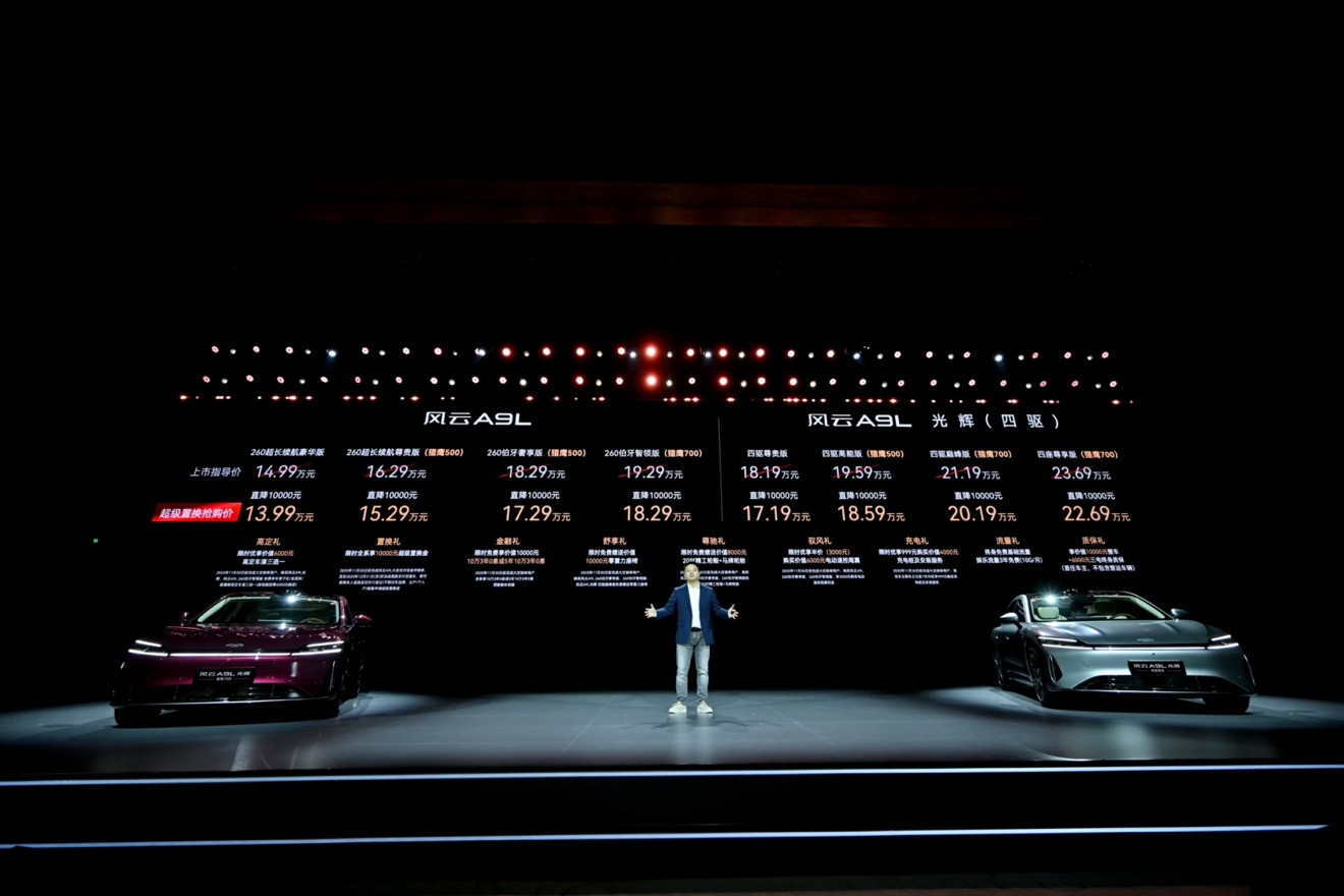 2025年11月15日,"进化"风云A9L光辉(四驱)全球上市发布会在重庆广阳岛国际会议中心隆重举行,本次上市共推出四款版型,正式售价为17.19万元起,共推出四个版本车型,其中四驱尊贵版售价17.19万、四驱高能版(猎鹰500)售价18.59万、四驱巅峰版(猎鹰700)售价20.19万、 四驱尊享版(猎鹰700)售价22.69万。并同步推出"九大购车权益",涵盖高定、置换、金融、舒享、尊驰、驭风、充电、流量、质保多重礼遇,为中国豪华汽车市场再次立下全新标杆。