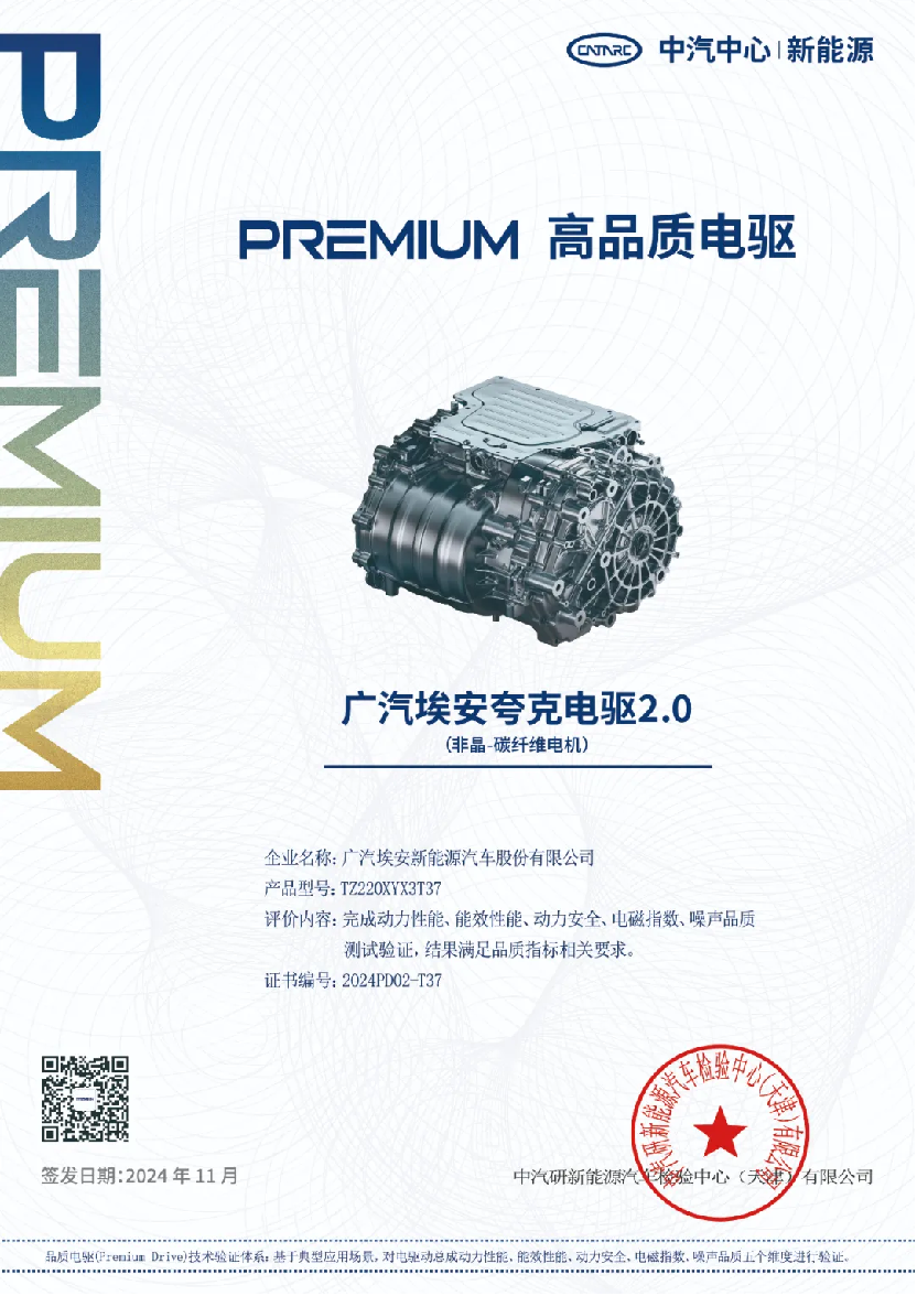 中汽中心新能源检验中心日前已正式发布2025版新能源汽车电安全技术验证体系(NESTA 2025版),对未来新能源汽车的安全标准提出了更为全面且严苛的评判标准,标志着新能源汽车行业在电安全技术领域迈入里程碑式的新纪元,而昊铂旗下的夸克电驱2.0依托自身卓越的技术实力,突破瓶颈,成功通过NESTA 2025版的认证,并荣获第二批“Premium Drive 高品质电驱”证书,不仅为电驱技术树立了行业新标杆,更以全球第一电机转速惊艳世界,让昊铂品牌在豪华智能电动汽车领域再度展现强大的科技实力。