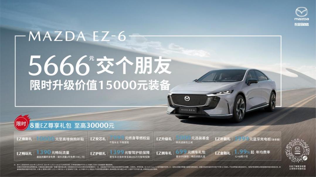 为回馈广大用户和粉丝的支持和喜爱,“双十二”购物节期间(即日起至2024年12月31日前),下订MAZDA EZ-6智雅版(增程200智雅版、纯电600智雅版),最低仅需5,666元即可选装原价为15,000元的「乐享逐风套装」,最高立减14,334元,一步到位,畅享顶配车型体验。