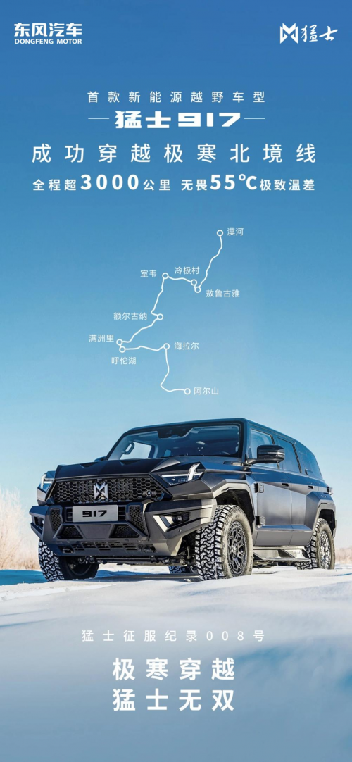 东风猛士917是中国首款穿越极寒北境线的新能源越野车型。车队自内蒙古阿尔山市启程,一路向北途径满洲里、额尔古纳、室韦、敖鲁古雅前往漠河,自由驰骋于千里北疆的冰雪世界,穿越超过3000公里的冰雪路面,直面高达55℃的温差考验,成功完成极寒挑战。