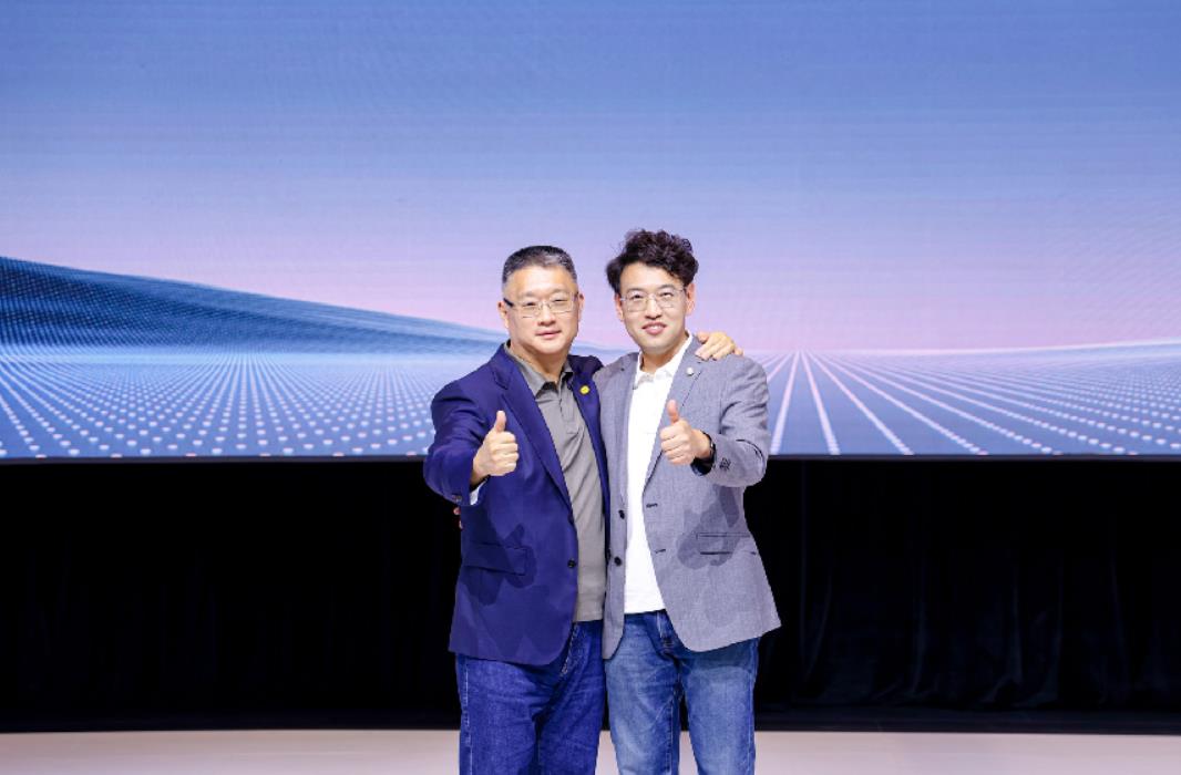 上汽集团总裁贾健旭(左)与火山引擎汽车总经理杨立伟(右)合影