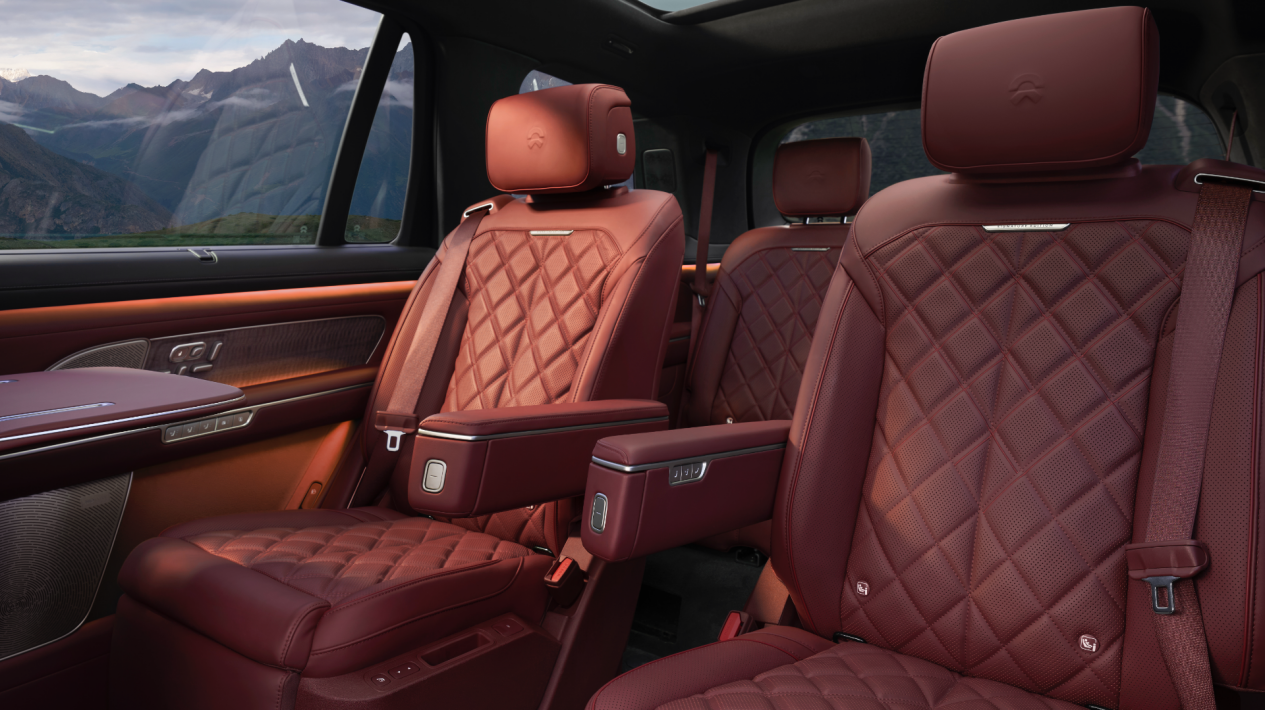 全新 ES8 通过极具匠心的材质选择,在细节中凸显豪华高级感。同级最大 52 平米软包覆面积,实现主接触面 100%覆盖; 座椅采用 Nappa 真皮,结合 12 万刺绣绗缝针脚勾勒的双线菱格纹与精致座椅滚边,触感细腻;「寰宇星轨」金属拉丝音响罩盖、 27.5 米缎光饰条、臻选云影真木等细节配置让座舱拥有高级定制般的质感。帕米尔棕、珍珠贝、黛山蓝、苏木红四大内饰主题颜色精心匹配不同材质,营造更尊崇得体的座舱氛围。