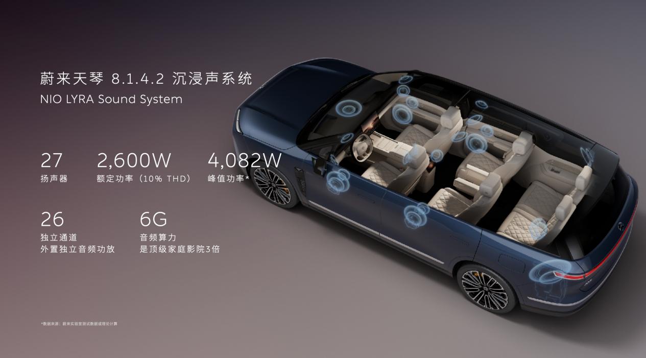 全新 ES8 引领全感官极致座舱视听体验。蔚来天琴 8.1.4.2 沉浸声系统拥有 27 个扬声器、 2,600W 额定功率和 4,082W 的峰值功率,支持杜比全景声,远超行业顶级音响水准。搭载全球首发的 Dirac RRM「超境临场」技术,声场还原能力行业第一。