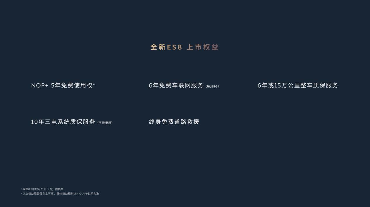 2025 年 12 月 31 日(含)前下定蔚来全新 ES8 的用户,将享受以下权益: 5 年免费全域领航辅助 NOP+使用权,以及价值 2,980 元的飞航头等舱五件套,包含舒适软枕套装、第三排侧窗遮阳帘、全车簇绒脚垫、前备舱防护储物垫以及智能香氛瓶套装。全新 ES8 首任车主还可享受 6 年免费车联网服务、6 年或 15 万公里整车质保服务、10 年不限里程三电质保服务和终身免费道路救援。