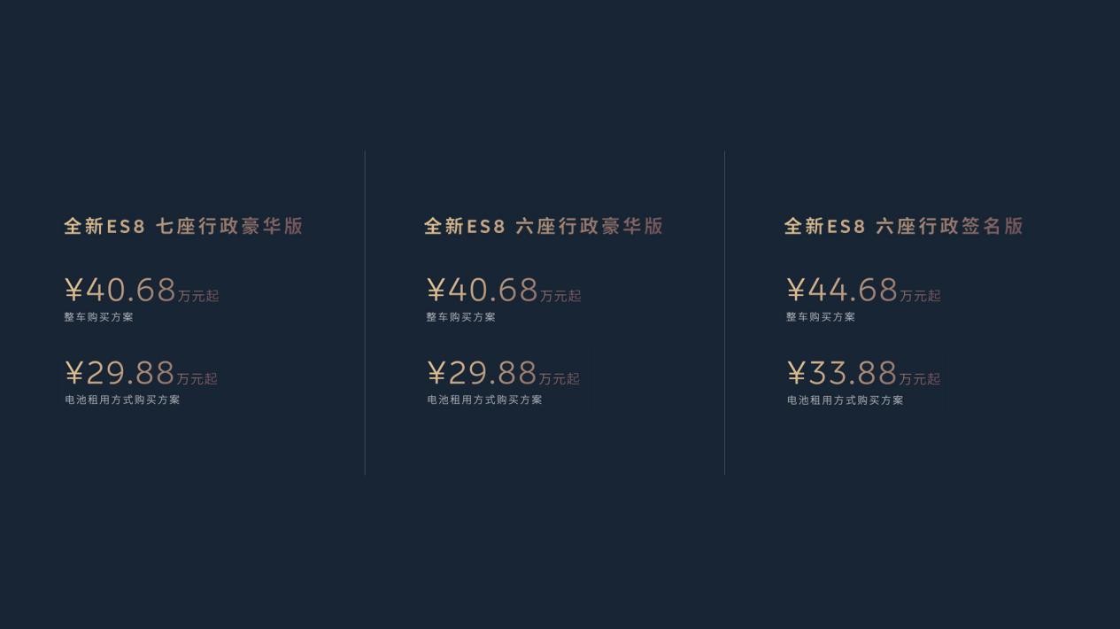 (9 月 20 日,杭州)2025 蔚来日( NIO Day 2025)9 月 20 日在杭州举行,蔚来宣布全场景科技旗舰 SUV —— 全新 ES8 正式上市。六座行政豪华版售价 406,800 元起,采用 BaaS 电池租用方式购买,售价 298,800 元起;六座行政签名版售价 446,800 元起,采用 BaaS 电池租用方式购买,售价 338,800 元起。七座行政豪华版售价 406,800 元起,采用 BaaS 电池租用方式购买,售价 298,800 元起。七座车型可选专属签名套装,价格为 36,000 元,包含智能高清投影大灯、智能调光隐私车窗、高性能四活塞气辉橙卡钳、22英寸锻造星耀轮圈、NOMI Mate 3.0 以及专属尾标。全新 ES8 将于 9 月 21 日起正式开启交付。