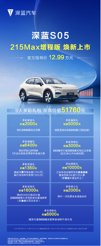 深蓝S05 215km增程版的登场,精准回应了用户对于续航、能耗、动力、超充以及整车综合体验的升级需求,巩固了深蓝S05作为15万内SUV出行标杆的行业地位。焕新进阶的深蓝S05全系产品,既是新央企新深蓝诚意满满的力作,也是深蓝汽车用技术实力赋能用户体验的集中体现。深蓝S05将以全方位的体验升级和安全满满的出行保障,为你的每一次出发注入安心与愉悦,将高品质的出行体验带入万千家庭。