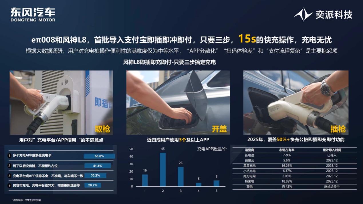 充电体验方面,化繁为简,消除用户痛点。首推支付宝“即插即充即付”功能,“取枪、开盖、插枪”三步15秒即可完成充电。该功能已在东风风神L8上首发,并即将搭载于东风奕派eπ008,今年底覆盖主流充电桩品牌,让“无感充电”成为标配。