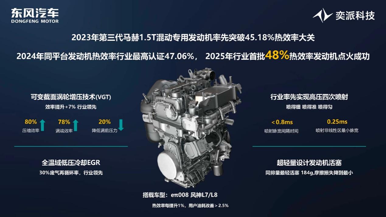 能效方面,打造行业标杆。第三代马赫1.5T发动机成为行业首款突破45%热效率的发动机,马赫首款48%热效率发动机已成功点火,再次刷新行业标准。马赫电混还引领插混SUV全面进入“3升油耗时代”,其中东风风神L7的公告油耗位列同级最优。