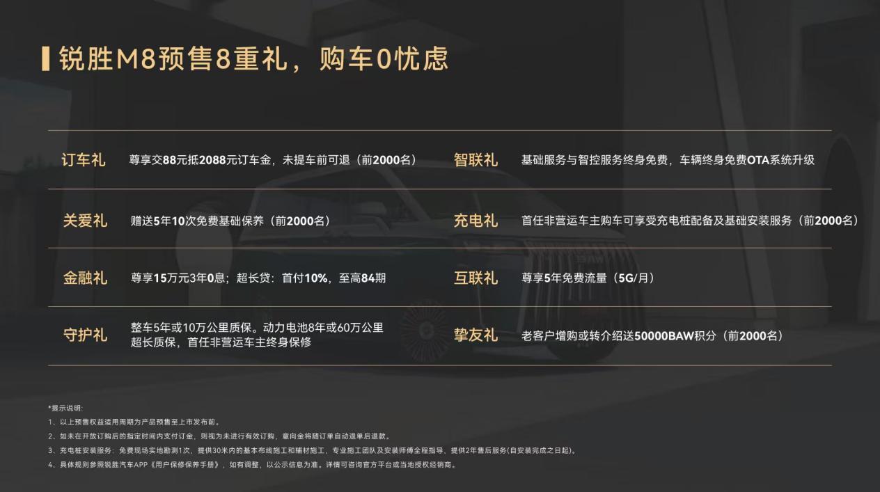 新程启幕,权益护航。预售期间下订用户可享限时权益,尊享价值至高2.98万元的八项专属好礼,全程尽享无忧体验。