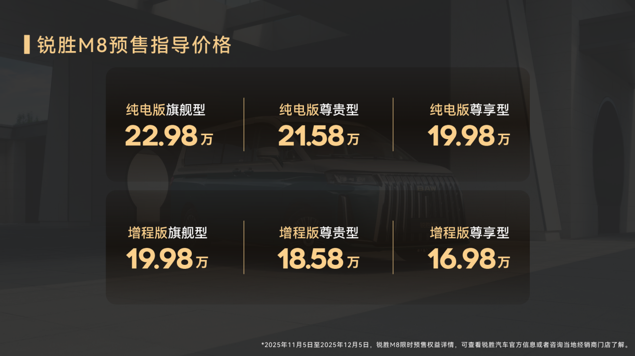 锐胜M8大型MPV正式预售 16.98万起,三排都是商务舱