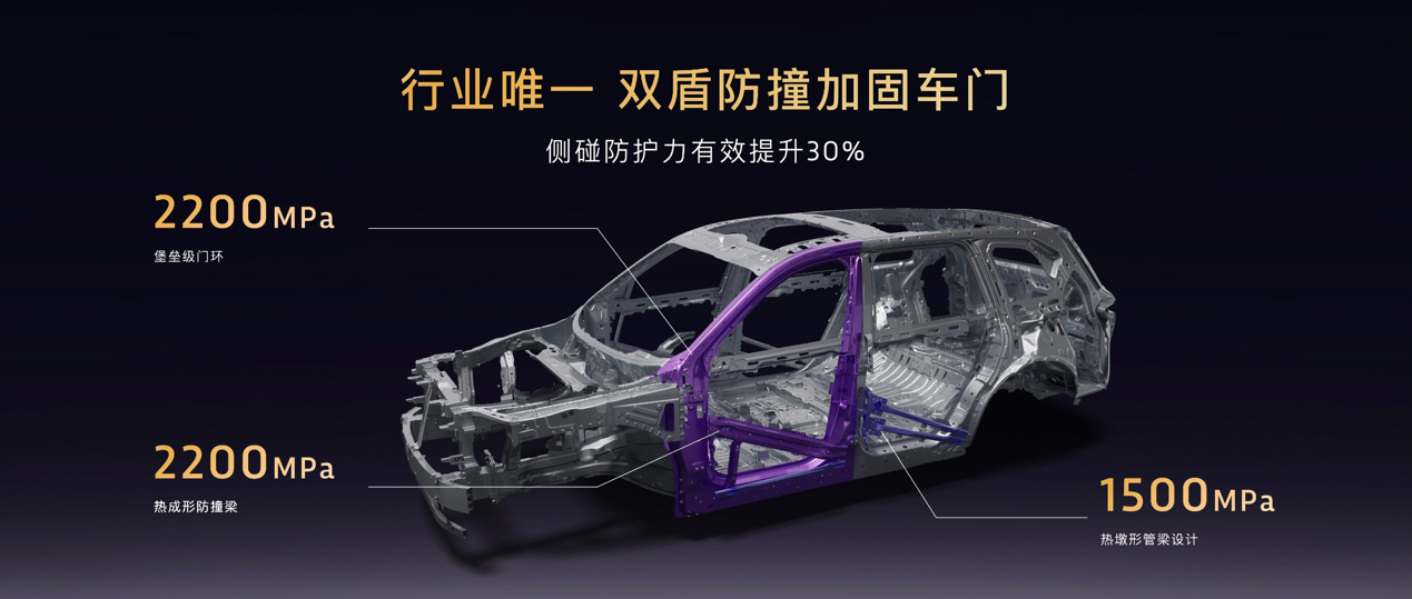 一直以来岚图始终认为,安全是最大的豪华。岚图泰山具备行业领先的高强度钢铝混合豪华车身,关键防护部位更采用24.5%顶级热成形钢,更使用行业唯一的双盾防撞加固车门,将车门刚度从2000MPa提升至2200MPa,做到行业目前最高的标准。2200MPa车门防撞梁与一体式门环,可使无论意外来自何方,都能最大程度抵御冲击,实现行业领先的顶级全车乘员保护。